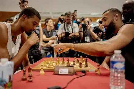 Le jeune homme a gagné la partie, le geste de la main de son adversaire exprime habituellement la surprise et la reconnaissance de sa défaite.