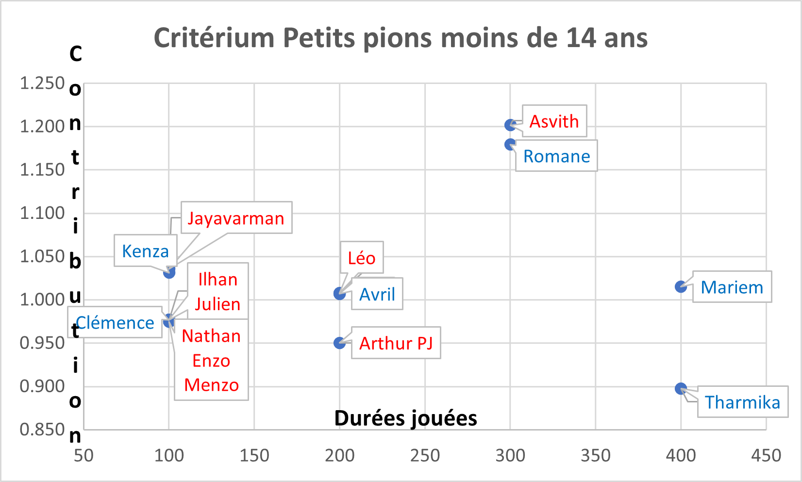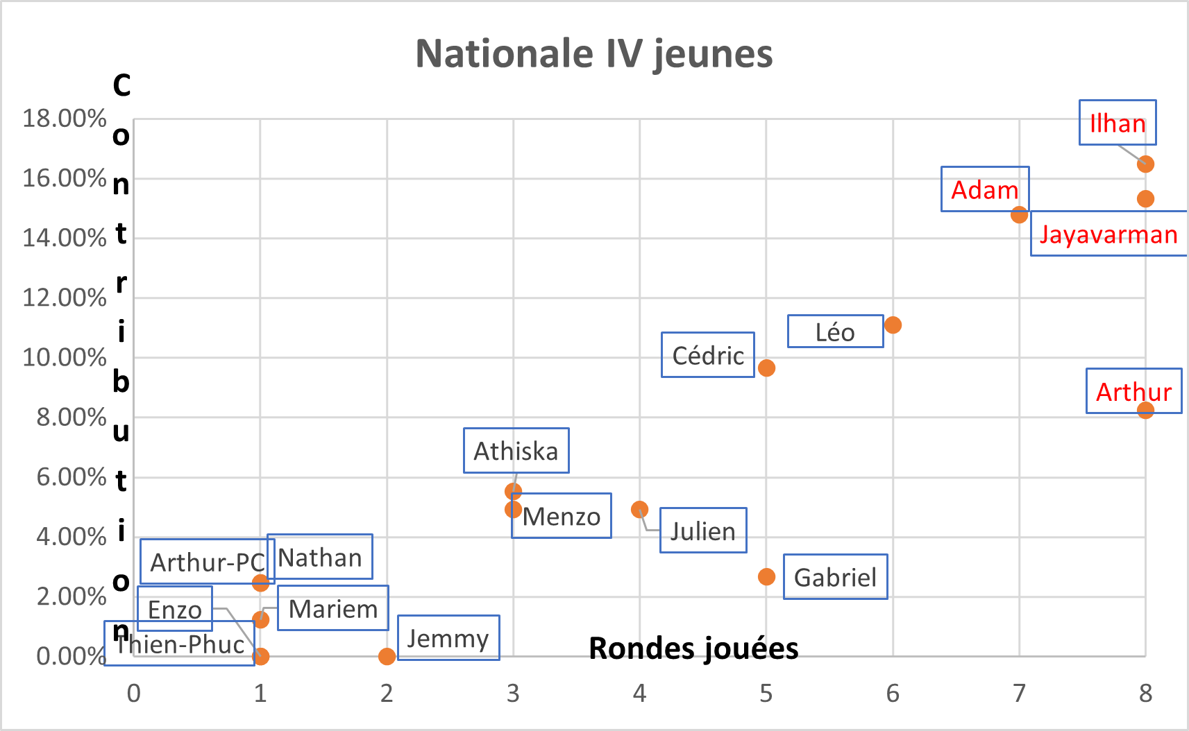 Ilhan a le mieux contribué aux résultats de nos jeunes, suivi de près par Adam et Jaya. Léo a fait une très belle saison pour sa toute première participation.
